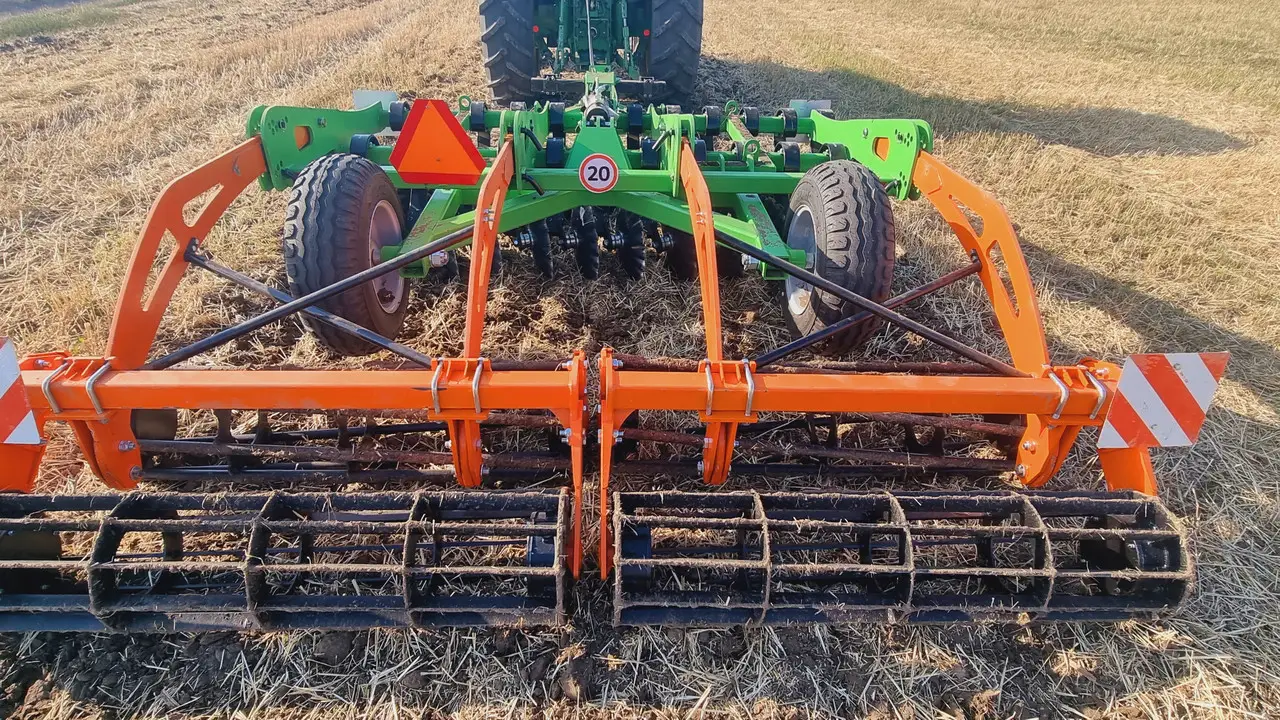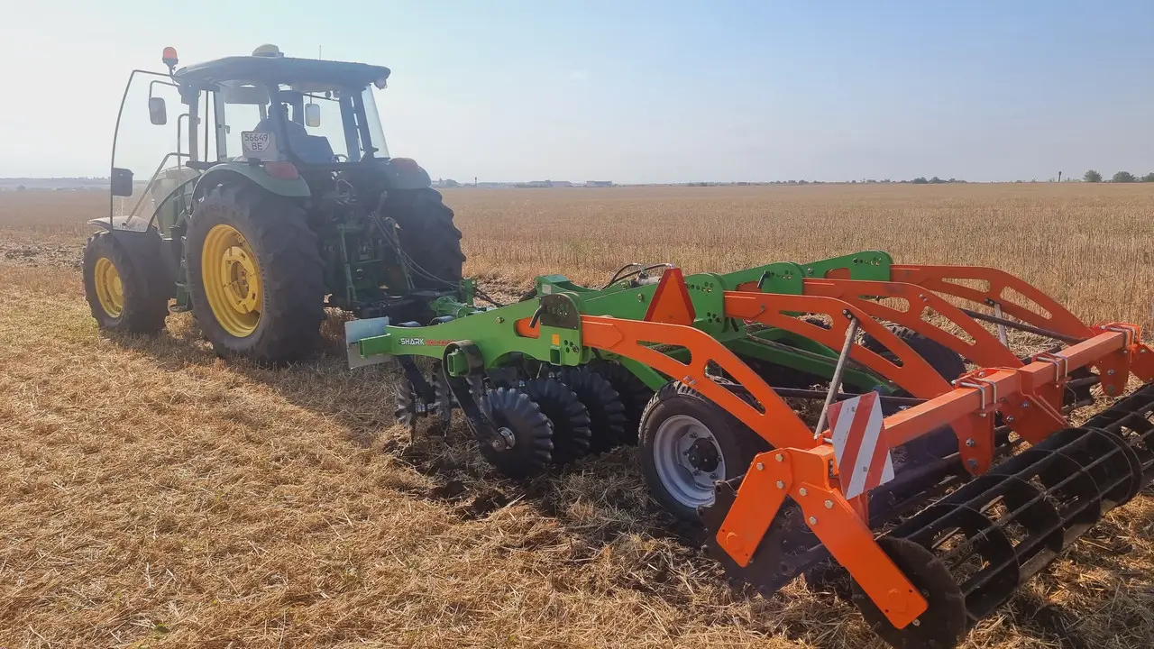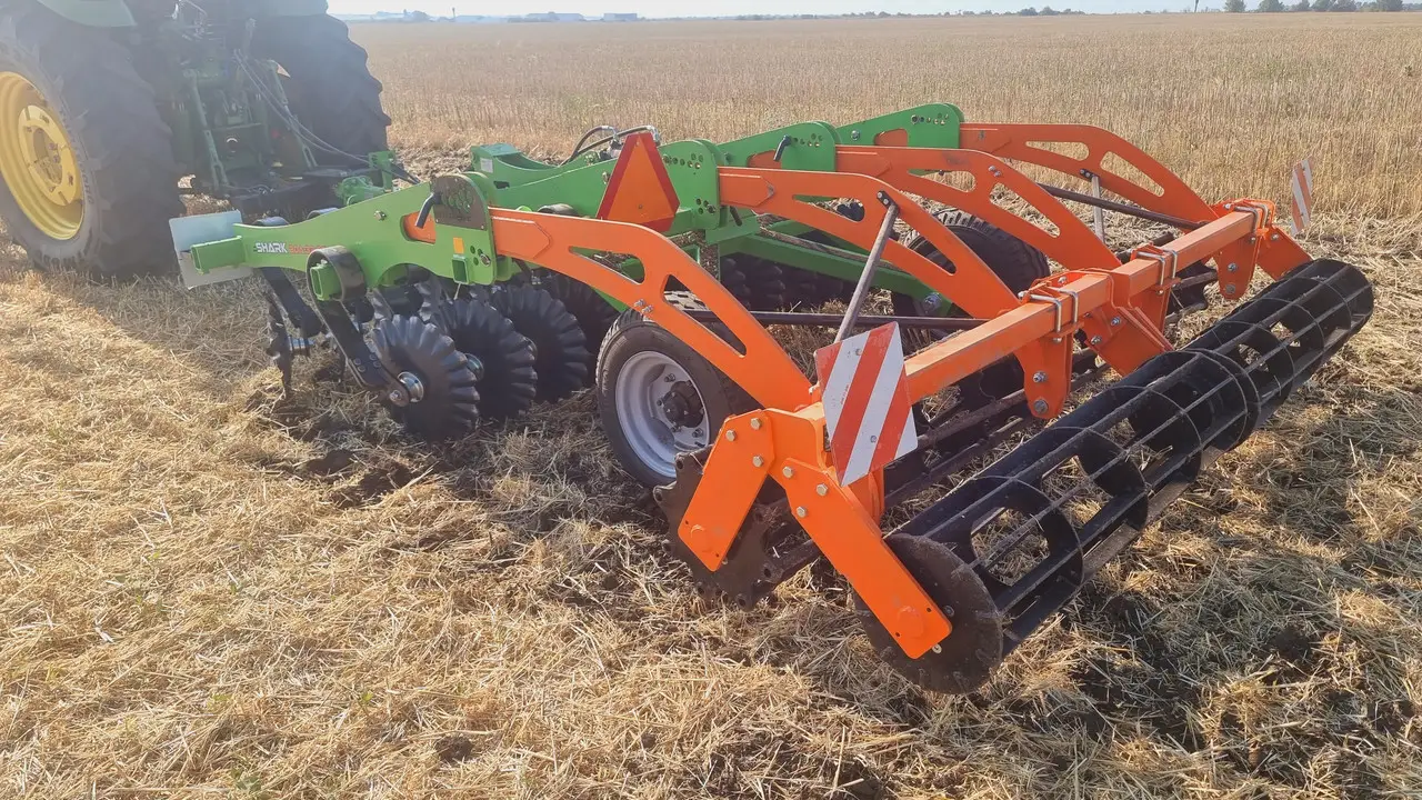 Основные преимущества: 1. Опорные колеса расположены в середине агрегата, благодаря чему произошло изменение центра тяги дисковой бороны Shark, стало гораздо стабильнее выполнять свои задачи. 2. Отсутствуют “прыжки” агрегата и не равномерный обработкой поля (в процессе работы ось опорных колес поднимается по центру машины и дает дополнительный вес) благодаря чему борона с легкостью работает в агрессивной среде. Даже в период сильной засухи борона идеально выполняет свою работу. 3. Благодаря изменению расположения колес улучшилась маневренность при разворотах во время работы (что позволяет работать клиенту на не больших участках поля, так и при транспортировке по дорогам общего назначения. Для увеличения скорости передвижения при транспортировке на опорные колеса установили ступицы закрытого типа европейского изготовителя FAT. 4. На новых дисковых боронах начали использовать тандемный – комбинированный «котик» (один из полосы диаметром 360 мм. Другой из трубы диаметром 430 мм.). 5. На замену винтовой регулировке, пришла пальцевая регулировка катка, что намного упрощает жизнь механизатора, ведь механизатор постоянно сталкивался с проблемой ушиба резьбы, вычисления витков или использования линейки или рулетки для правильного выставления катка). Сейчас все гораздо проще – выставление глубины путём переставления пальцев с диапазоном от 2 до 15 см. 6. Подшипниковый узел катку получил дополнительную защиту от повреждений, забивания питательных остатков и налипания грунта, что на 70% увеличивает его ресурс. 7. Усиление рамы. Для долговечности эксплуатации агрегата «раму усилили» за счет использования листового металла толщиной 18 мм. 8. Для безопасного передвижения по дорогам общего назначения на дисковую установили габаритные специальные знаки, благодаря которым не столкнетесь с нарушением ПДД.