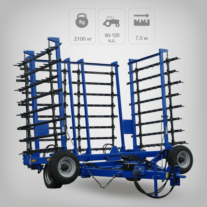 Надійна конструкція рами, виконана з цілісних труб, значно підвищує міцність шлейф борони. Борона розрахована на експлуатацію в будь-яких кліматичних умовах з усіма типами грунтів і без проблем справляється навіть з найважчими, засміченими або засоленими ґрунтами. Гострі зуби борони гарантовано знищують до 85% бур’бур’янів. На відміну від культиваторів, шлейфова борона БШ-7,5 абсолютно нейтральна до вологим грунтам – ніщо в її конструкції не буде ні прилипати, ні липнути. Шлейф-борона БШ-7,5 з’єднання єднується з тракторами 3-го тягового класу. У стандартному режимі роботи її швидкість 8-12 км / ч.