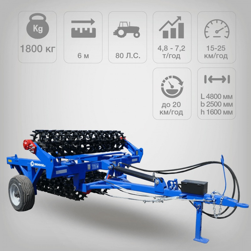 Каток подрібнювач КП-6 ККШ володіє наступними технічними характеристиками:ширина захвату становить 600 см;